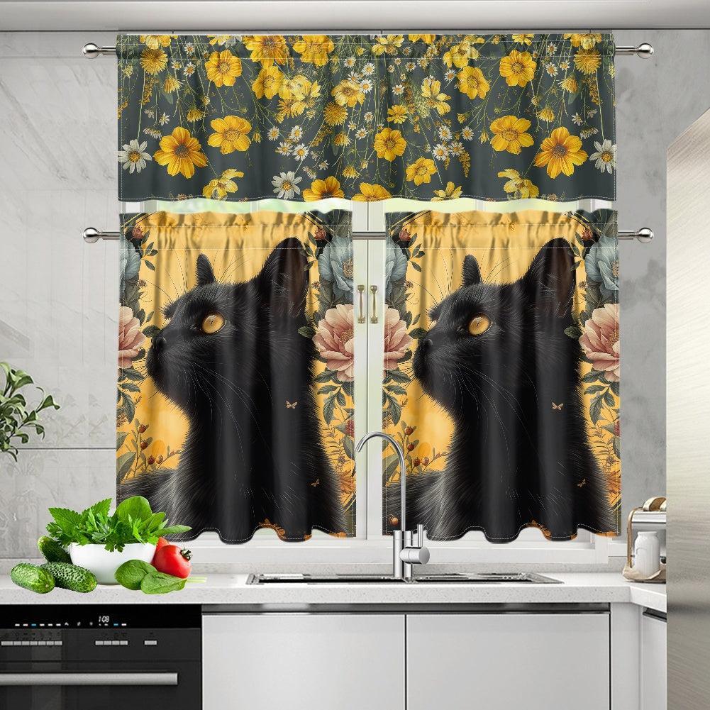 Wildflower black cat Kitchen Curtain Valance and Tiers Set | Sense Forest